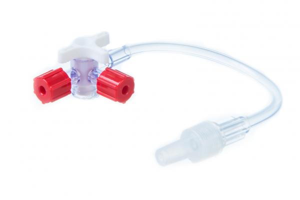 4 Way Stopcock, Lipid Resistant, with PVC Extension Line 13.5cm x 2.5mm ID, Luer Lock, with Red End caps, Priming Volume ~ 0.8ml *LATEX FREE*